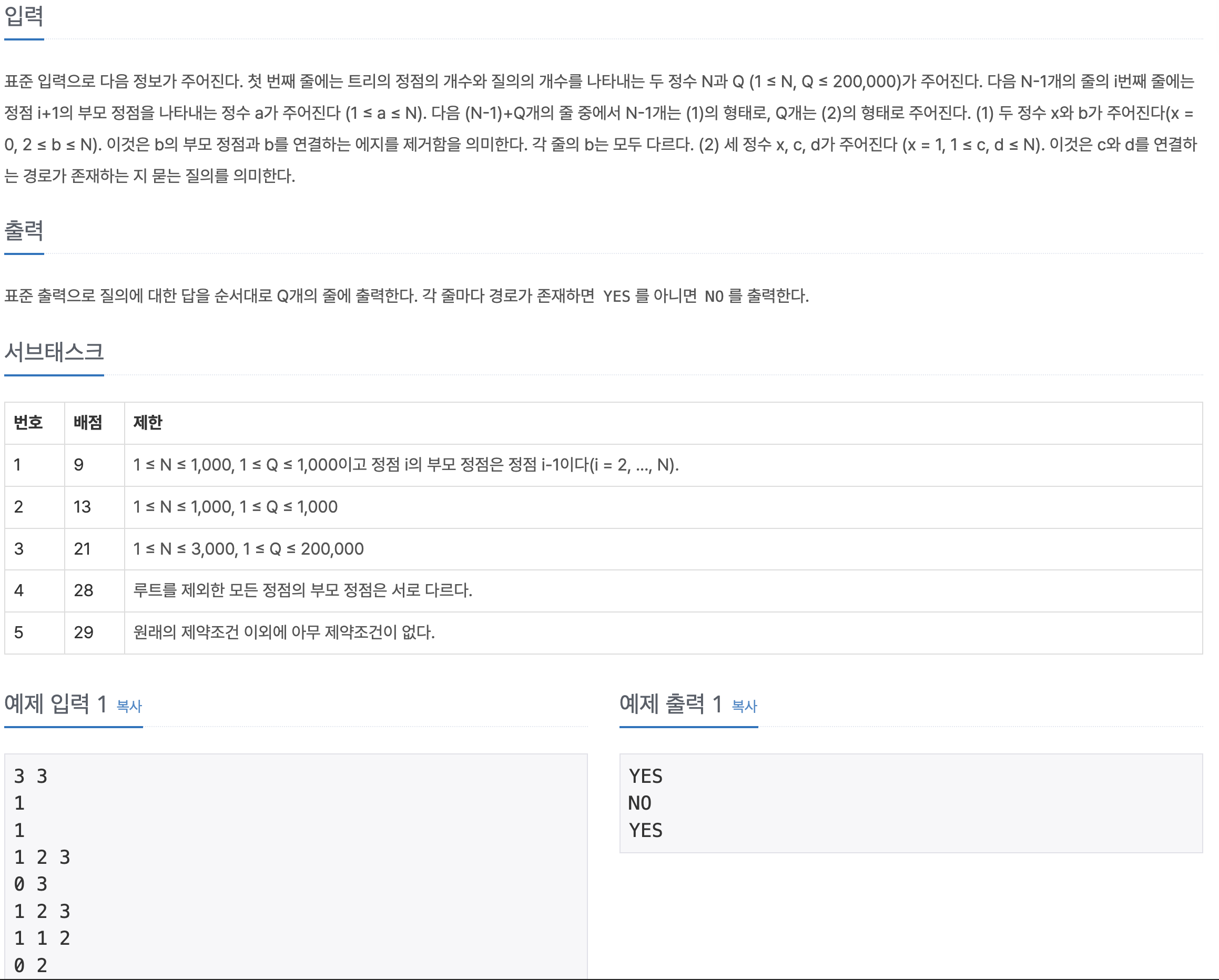 #include <iostream> #include <vector> using namespace std; using pii = pair <int, int>; int n, q, originalParent[200'001], parent[200'001]; vector <int> ans; vector <pii> queries; int Find(int a) { if(parent[a] == a) return a; return parent[a] = Find(parent[a]); } void Union(int p, int c) { int pRoot = Find(p), cRoot = Find(c); if(pRoot == cRoot) return; parent[pRoot] = cRoot; } int main() { ios_base::sync_with_stdio(0); cin.tie(0); cout.tie(0); cin >> n >> q; for(int i = 2; i <= n; i++) { cin >> originalParent[i]; } int x, a, b; for(int i = 0; i < (n-1) + q; i++) { cin >> x; if(x == 0) { cin >> a; queries.push_back({a, -1}); } else { cin >> a >> b; queries.push_back({a, b}); } } for(int i = 1; i <= n; i++) parent[i] = i; for(int i = queries.size()-1; i >= 0; i--) { pii query = queries[i]; if(query.second == -1) { // Union Union(query.first, originalParent[query.first]); } else { int fRoot = Find(query.first), sRoot = Find(query.second); if(fRoot == sRoot) ans.push_back(1); else ans.push_back(0); } } for(int i = ans.size()-1; i >=0; i--) cout << (ans[i] ? "YES" : "NO") << '\n'; }